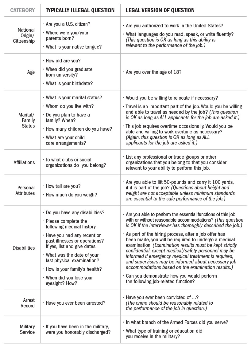 When interviewing prospective employees, there are several areas that cannot be discussed at the time of the interview or any time prior to employment. At right is a chart that can be used when interviewing.